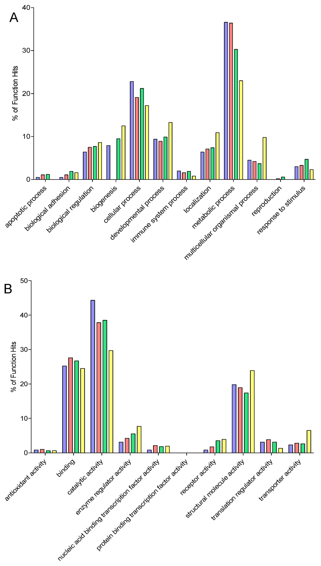 Gene ontology analysis. Gene ontology analysis was performed using the PANTHER software. Proteins were grouped according to (A) biological function, (B) molecular function and (C) cellular component. 1-D SDS-PAGE is represented by blue bars, ProteoMiner by red, OFFGEL by green and FASP by yellow.