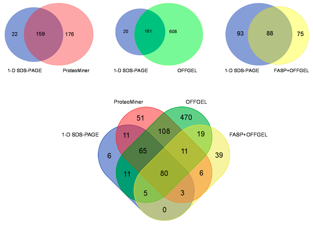 Overlap of Protein Identifications. There were 80 identified proteins common to all experimental approaches. OFFGEL analysis yielded the greatest number of uniquely identified proteins, followed by ProteoMiner, FASP with 1-D SDS-PAGE having the fewest.