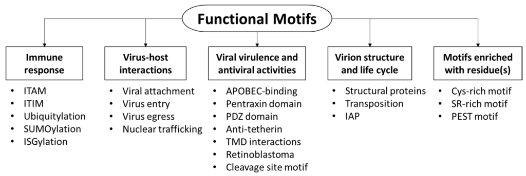 Viruses utilize a number of functional motifs to attach and enter into host cells, or interact with cellular proteins. This article aims to review the current understanding of motifs utilized by viruses for fruitful infection, highlighting the function of motifs and/or proteins harboring these motifs, in an attempt to classify the motifs based on the molecular function of the harboring proteins. The motifs can be classified into five main categories (Figure 1): (i) motifs that mediate immune response; (ii) virus-host interactions, including entry and cellular trafficking; (iii) virulence and antiviral activities, which may disturb cellular processes; (iv) virion structure; and (v) motifs enriched with residues.