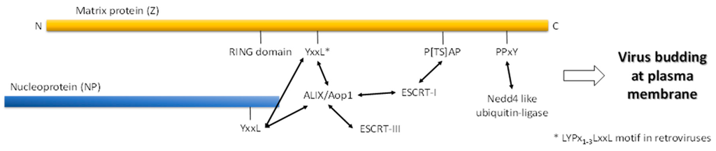 A schematic diagram of arenavirus late-domain motifs and their role in interaction with cellular proteins leading to virus budding and egress from the cell [67].
