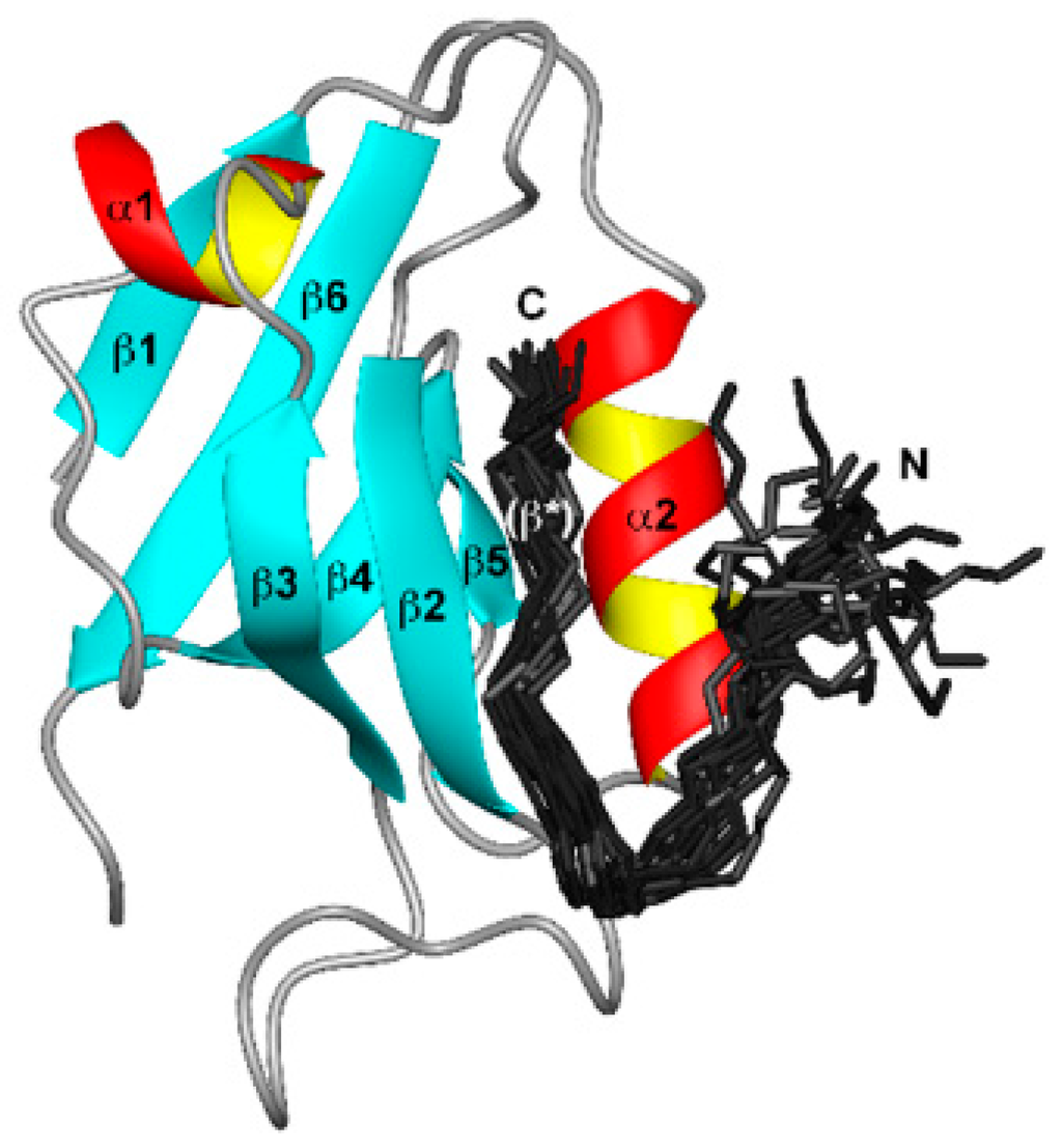 Binding of HPV E6 to the second PDZ domain (PDZ2) from the human homologue of the Drosophila discs large tumor suppressor protein (hDlg). E6 (150 residues) consists of two zinc-binding domains (Cx2Cx29Cx2C). The bundle of 20 best E6 structures (residues 141 to 151, dark grey). Adopted and modified from [156], published under Creative Commons Attribution license.