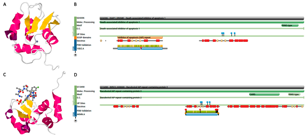 (A) Structure of death-associated inhibitor of apoptosis 1 (DIAP1) protein of Drosophila melanogaster (PDB ID: 1SDZ, Uniprot ID: Q24306) [179]; (B) protein features show that it belongs to the IAP family, and contains two BIR repeats and a RING-type zinc finger; (C) structure of baculoviral IAP repeat-containing protein 2 (BIRC2) of human (PDB ID: 4KMN, Uniprot ID: Q13490); (D) protein features show that it contains three BIR repeats, a CARD domain and a RING-type zinc finger. The figures adopted from PDB and Uniprot.