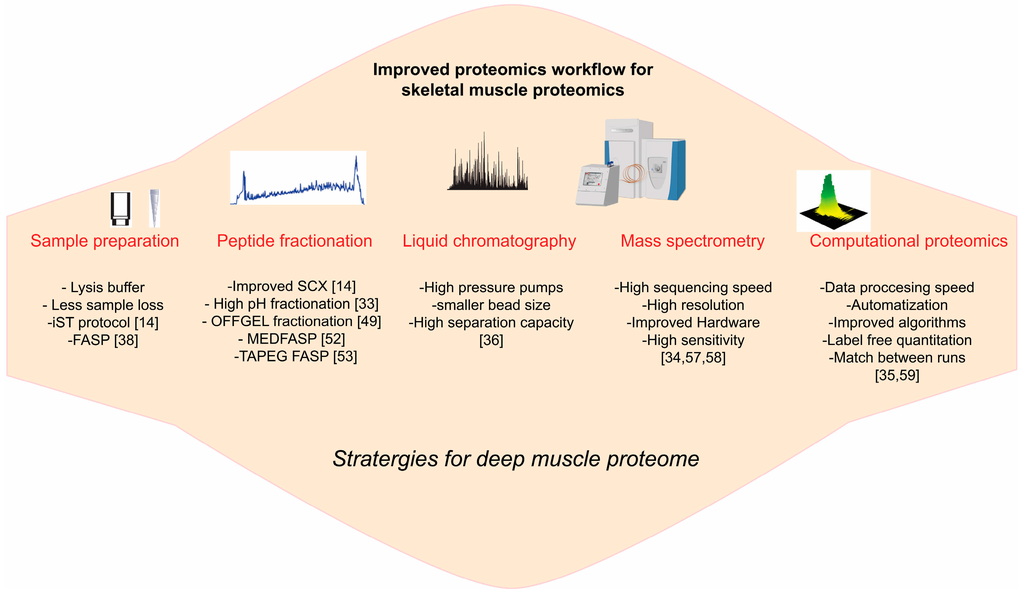 MS based proteomics is rapidly growing field with constant advent of varieties of sophisticated technologies with regards to sample preparation, peptide fractionation, LCMS instrumentation and bioinformatics analysis [14,33,34,35,36]. These technologies have not yet fully exploited in the field of skeletal muscle proteomics (Figure 2).