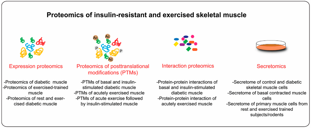 Proteomics of insulin-resistant and exercised skeletal muscle: the proteomics application of insulin resistant and exercised skeletal muscle can be broadly classified under three categories, expression proteomics (global protein expression profile), PTMs (posttranslational modifications), and secretomics (secretion profiles of muscle cells).