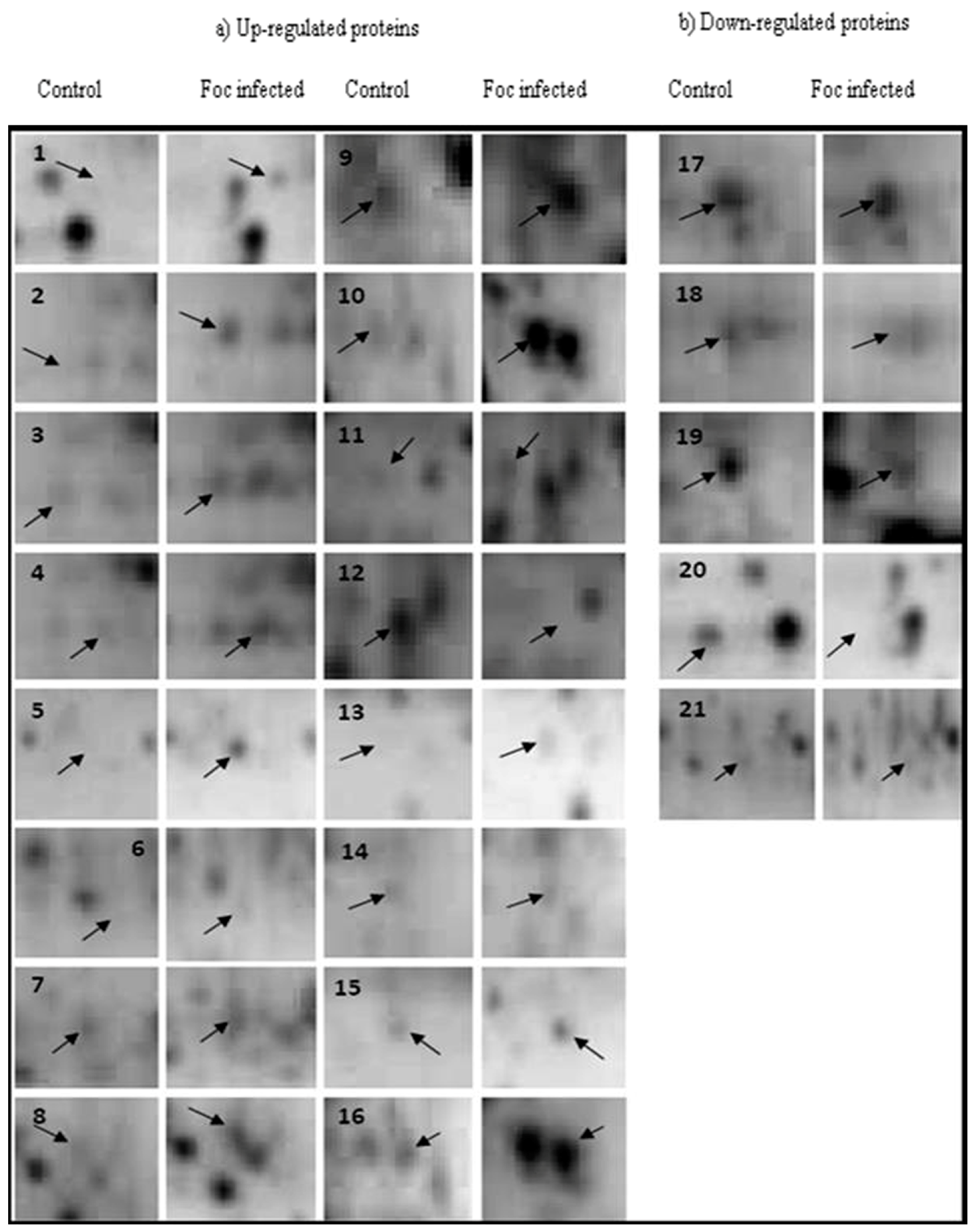 Resolved 2-DE images of differentially accumulated proteins. (a) Up-regulated protein spots upon infection of Fusarium oxysporum f. sp. cubense to banana cv. Puttabale; (b) Down-regulated protein upon infection of Fusarium oxysporum f. sp. cubense to banana cv. puttabale. 1 Pathogenesis-related protein; 2 Ring fyve phd zinc finger protein; 3 Dehydroascorbate reductase; 4 Salicylate o-methyltransferase-like; 5 Sucrose synthase; 6 Dynein heavy chain; 7 Pathogenesis-related protein; 8 Cadmium/zinc-transporting atpase; 9 26s proteasome non-atpase regulatory subunit; 10 Ras-related protein rabb1c-like; 11 Alcohol dehydrogenase 1; 12 Polyphosphoinositide binding protein ssh2p; 13 Albumin-1 D; 14 Peptide methionine sulfoxide reductase chlo; 15 Disease resistance rpp13-like protein 1-like; 16 Subtilisin-like protease; 17 Protein odr-4; 18 Lrr repeats and ubiquitin-like domain-containing protein; 19 Auxin-responsive protein; 20 60s acidic ribosomal protein p2a; 21 Leafy-like protein.