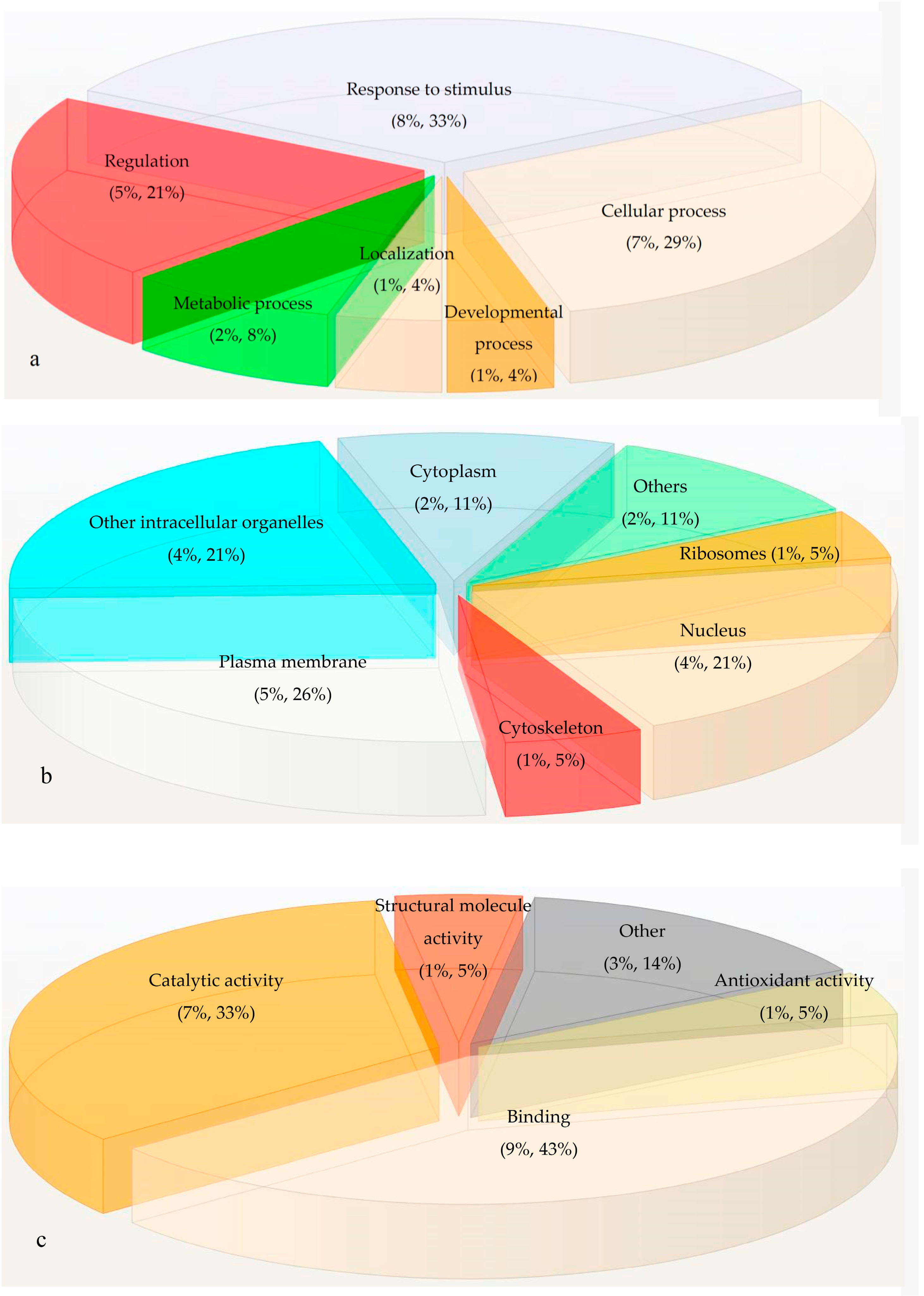 Gene ontology of differentially accumulated proteins using STRAP tool (a) Biological process; (b) Cellular process and (c) Molecular function.