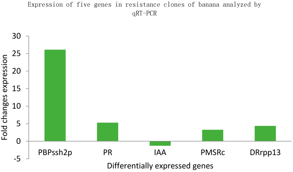 The qRT-PCR amplification of PR, DRrpp13, PMSRc, and PBPssh2p genes showed an increase in fold change expression. In contrast, the IAA gene showed a decreased fold change expression in resistant clones, as shown in Figure 4. The qRT-PCR experiment also highlighted that the gene PBPssh2p was significantly up-regulated with a 26.11 fold change and the gene IAA was down-regulated to a −1.27 fold change in Fusarium inoculated resistant clones as compared to susceptible clones.