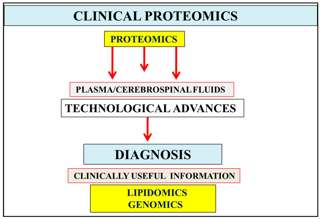 The early diagnosis of Alzheimer’s disease (AD) has become important to the reversal and treatment of neurodegeneration, which may be relevant to premature brain aging that is associated with chronic disease progression. Clinical proteomics allows the detection of various proteins in fluids such as the urine, plasma, and cerebrospinal fluid for the diagnosis of AD. Interest in lipidomics has accelerated with plasma testing for various lipid biomarkers that may with clinical proteomics provide a more reproducible diagnosis for early brain aging that is connected to other chronic diseases. The combination of proteomics with lipidomics may decrease the biological variability between studies and provide reproducible results that detect a community’s susceptibility to AD. The diagnosis of chronic disease associated with AD that now involves genomics may provide increased sensitivity to avoid inadvertent errors related to plasma versus cerebrospinal fluid testing by proteomics and lipidomics that identify new disease biomarkers in body fluids, cells, and tissues. The diagnosis of AD by various plasma biomarkers with clinical proteomics may now require the involvement of lipidomics and genomics to provide interpretation of proteomic results from various laboratories around the world.