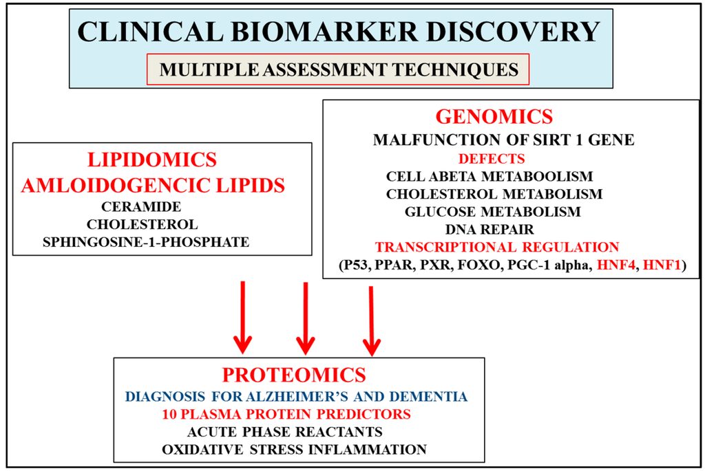 Discovery of biomarkers that are consistent with the stages of development of AD and involve progression that includes mild cognitive impairment, prodromal disease, and the development of dementia. Proteomics that involve 10 plasma protein predictors (AD/dementia) and acute phase proteins (MCI/prodromal disease) allow detection of the severity of the stages of AD. Interest in genomics has accelerated with the identification of the calorie-sensitive gene Sirt 1, which may allow early AD diagnosis when compared to relevant proteomic/lipidomic biomarkers (ceramides, sphingolipids) that are involved in the later stages of AD. Interventions with nutritional therapy may activate cell Sirt 1/transcriptional regulation and maintain glucose, cholesterol, and amyloid beta levels connected to the delay in the progression and severity of AD (stages 4–7). Furthermore, multiple technologies may separate and diagnose individuals with other neurological disease from AD that may involve plasma, CSF, and tissue analysis.