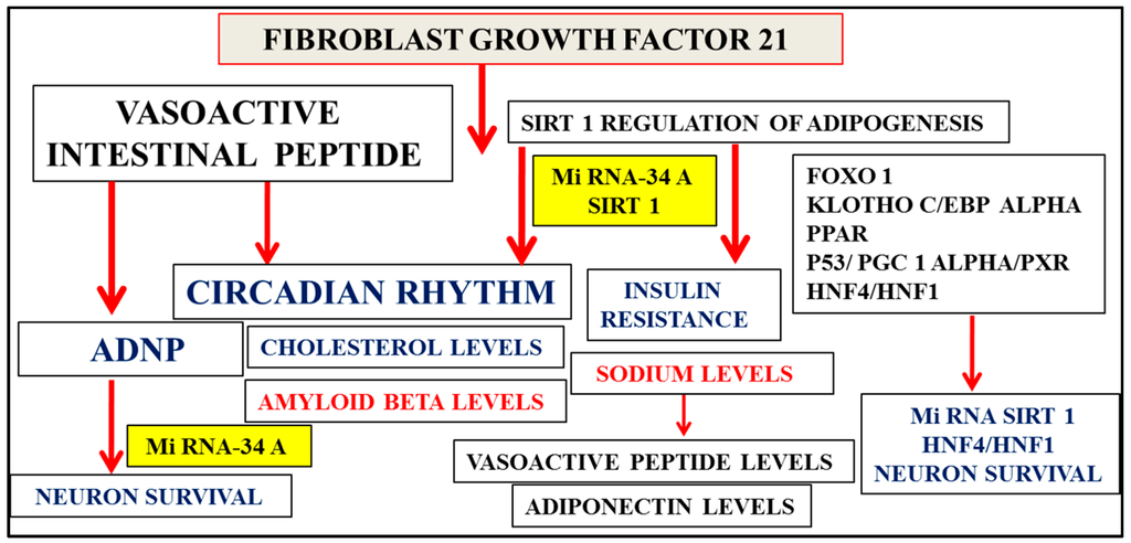 Fibroblast growth factor 21 (FGF21) regulates Sirt 1-mediated release of adiponectin from adipose tissue with relevance to NAFLD and the metabolic syndrome. Micro RNA, Sirt 1, and transcription factor interactions are possibly involved in vasoactive intestinal peptide (VIP)-mediated release of ADNP from neurons with critical links of Sirt 1 and ADNP in neuron survival. FGF21, Sirt 1, and VIP are associated with the circadian brain–liver amyloid beta clearance pathway with decreased VIP levels in plasma associated with excess sodium intake and sodium intake linked to adiponectin levels. Sirt 1’s downregulation, associated with insulin resistance, is linked to high plasma sodium levels and low plasma VIP levels. This is related to its vascular effects in the central nervous system, which determine hepatic amyloid beta metabolism and the regulation of apo E-mediated amyloid beta clearance pathways in the brain.