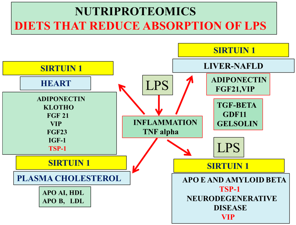 Nutriproteomic diets as a treatment for cardiovascular disease, NAFLD, and AD activate hepatic Sirt 1 and increase hepatic FGF21 and VIP levels relevant to the maintenance of the hepatic peripheral amyloid beta clearance pathways. LPS suppresses Sirt 1/adiponectin expression and increases TSP-1 release from cells with effects on adiponectin and peripheral amyloid beta/cholesterol clearance pathways. Nutritional therapy reduces LPS-induced inflammation and maintains hepatic TGF-β/cholesterol levels (apo AI, apo B); these nutriproteomic diets avoid the transfer of LPS/mycotoxin from the blood plasma to the CSF to prevent LPS/mycotoxin-induced brain apo E neutralization associated with the prevention of amyloidosis and neurodegeneration. Low calorie diets maintain plasma anti-aging protein GDF11, FGF21, VIP, gelsolin, insulin like growth factor 1 (IGF-1), and klotho levels, which are relevant to chronic diseases and AD.