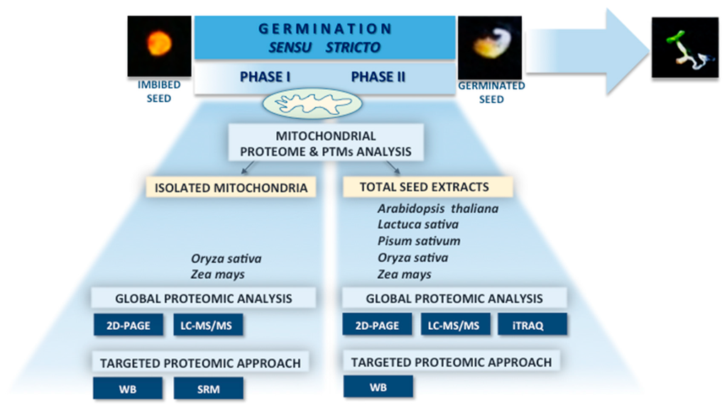 The success of sub-cellular proteomics lies undoubtedly in the high quality of the protein sample. Obtaining pure and intact organelles is critical and determines the extent of the proteome coverage and detection of low abundant proteins. To overcome the limitations in isolation of pure organellar fractions for studies of seed mitochondrial proteins, further technical advancements are of great importance in quantitative proteomic surveys. Isolating mitochondria from seeds, especially from small-sized seeds, is a challenging task and will probably continue to remain difficult, thus complicating mitochondrial proteomic assays. For seeds, from which the isolation of organelles is practically impossible, implementation of targeted proteomic approaches, such as SRM, may provide invaluable information about the dynamics of a specific group of mitochondrial proteins during different stages of seed germination. Additionally, a combination of targeted and global quantitative proteomic approaches will likely expand the knowledge about seed mitochondria and reveal novel aspects of mitochondrial biogenesis during seed germination. Furthermore, more comprehensive high throughput research is needed to gain information about the type and extent of post-translational modifications of individual proteins in seed mitochondria. The identification of PTMs should rely not only on the type of modification, but it should also determine the quantity of the particular PTM relative to the abundance of the modified protein. Because of the specificity towards protein targets, phosphorylation, S-nitrosylation and carbonylation of seed mitochondrial proteins might regulate their activity, turnover or interactions and, in consequence, metabolic and energetic processes involved in seeds during germination. Whether these mitochondrial PTMs represent a common pathway of regulation of seed germination is still an open question.