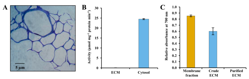 Analysis of isolated potato ECM fraction and determination of its purity. (A) Micrograph of a toluidine blue-stained section of potato leaflet showing the ECM specificity of the staining. (B) Determination of catalase specific activity in potato ECM and cytosolic fraction. The cytosolic fraction prepared from potato tissue for catalase activity was used as a positive control. (C) Determination of vanadate-inhibited H+ ATPase activity in the potato ECM and plasma membrane fraction. The plasma membrane fraction of potato was used as a positive control. Data represents experiments performed in triplicate and indicated as ± SD.
