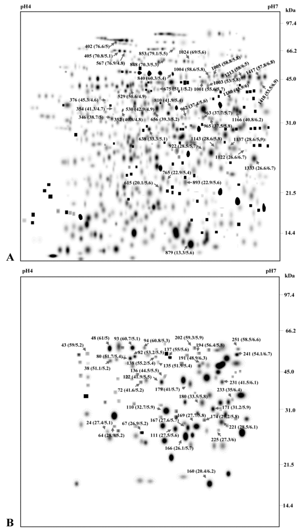 More than 329 protein spots and 88 phosphoprotein spots were detected on 13 cm gels pI 4–7, out of which 300 protein spots and 79 phosphoprotein spots survived the filtering process. While 24 cm pH 4–7 strips showed 733 protein spots and 259 phosphoprotein spots, with 704 high-quality protein spots and 241 phosphoprotein spots matched to our filtering criteria. The spots were numbered as StEP-1 to StEP-733 and StEPP-1 to StEPP-259 (the letteres ‘St’ identify the organism (Solanum tuberosum) and ‘E’ signifies the subcellular organelle (ECM) from which the proteome ‘P’ and phosphoproteome ‘PP’ map has been made, whereas the numerals indicate the spot numbers (Figure 2A,B).