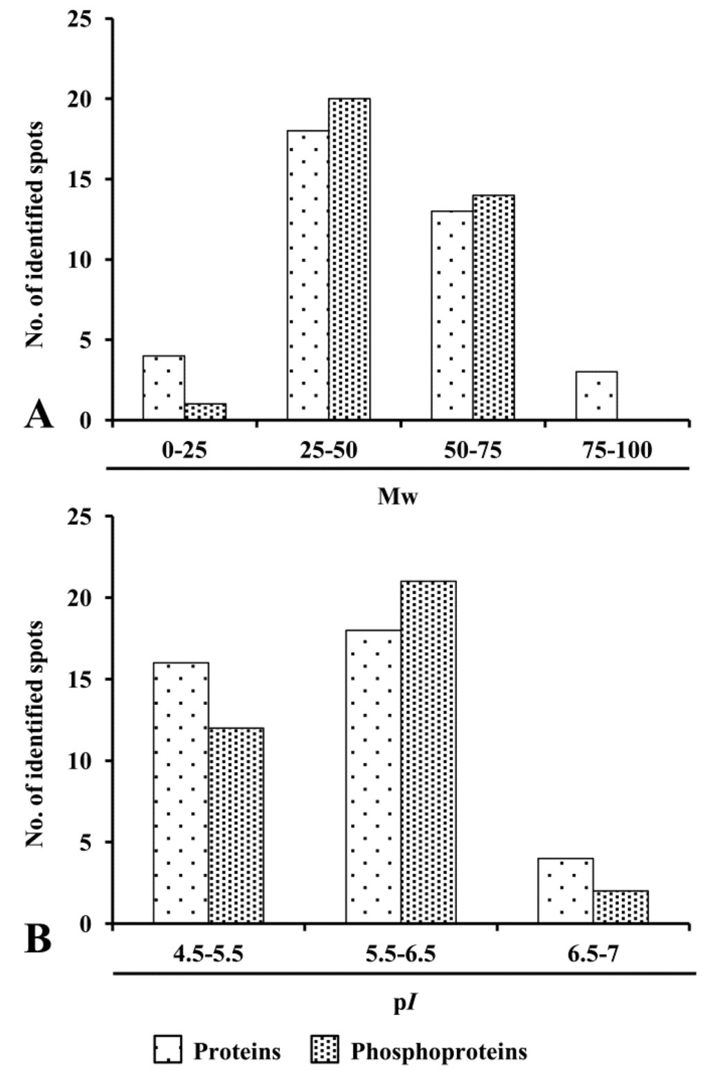 Physicochemical characteristics of proteins and phosphoproteins. Distribution of proteins and phosphoproteins based on (A) molecular weight (Mw) and (B) Isoelectric point (pI).