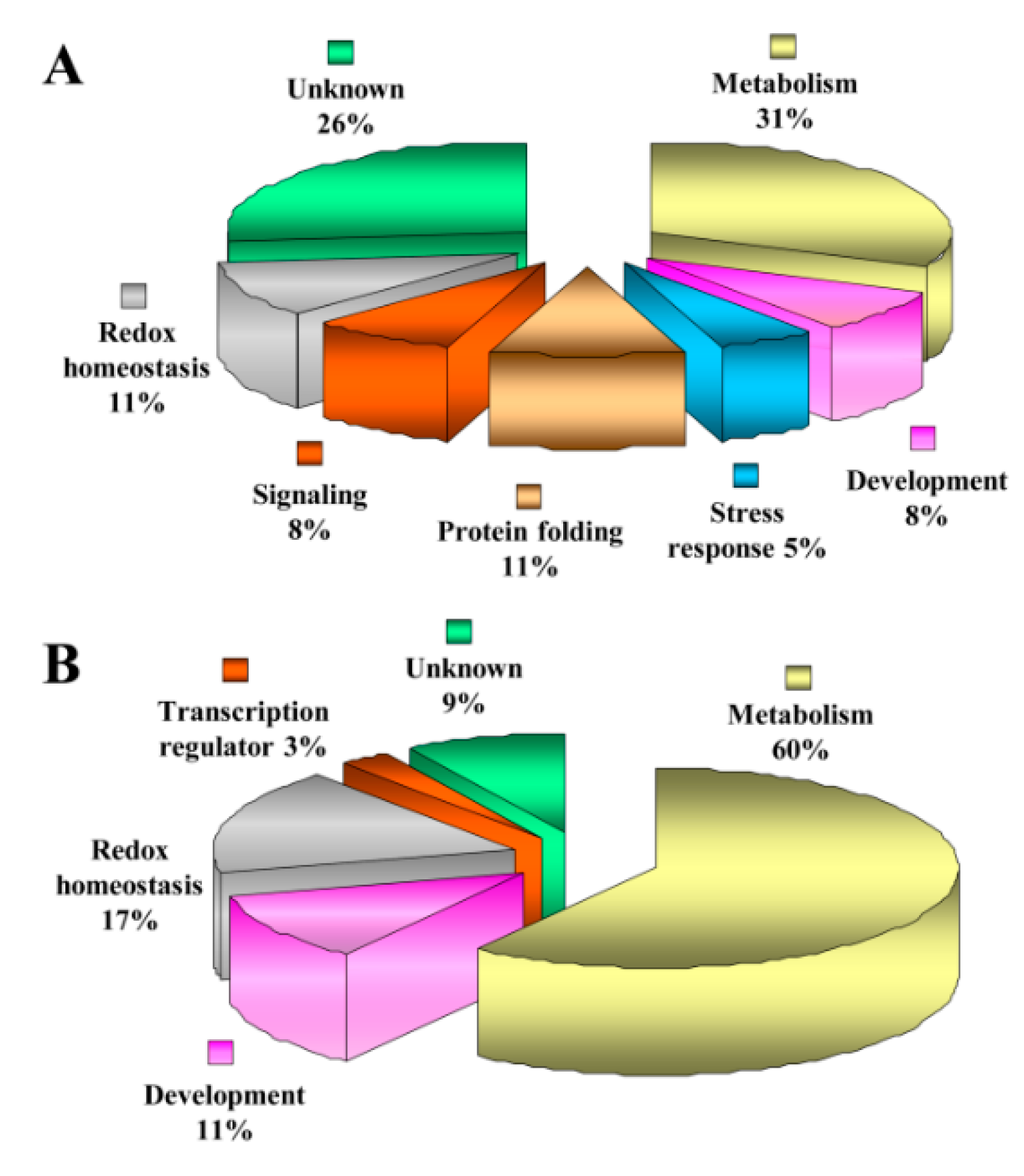 Functional cataloguing of identified spots. (A) Proteins and (B) phosphoproteins in ECM of potato. Putative functions were assigned to each of the candidates using protein function database.