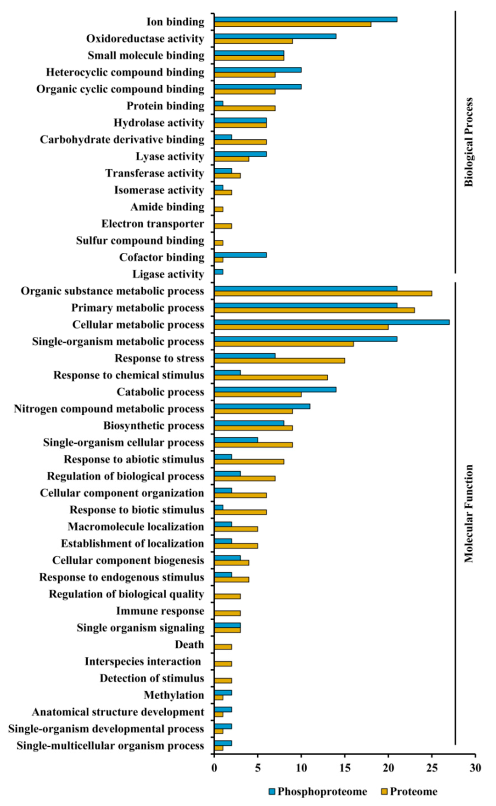 Further, Blast2GO analysis of the identified proteins and phosphoproteins revealed a wide range of biological processes and molecular functions, which can be classified into 16 and 25 categories, respectively. In terms of the number of proteins and phosphoproteins, the largest group within molecular function was found to be metabolic process (22.63% and 23.25%, respectively), followed by cellular process (19.25% and 14.28%, respectively) and response to stimulus (18.70% and 19.15%, respectively). The biological processes of these proteins mainly belonged to catalytic activity (53.23% and 48.21%, respectively), ion binding (18.22% and 12.25%, respectively) and structural molecule activity (5.23% and 4.11%, respectively) (see Figure 5).