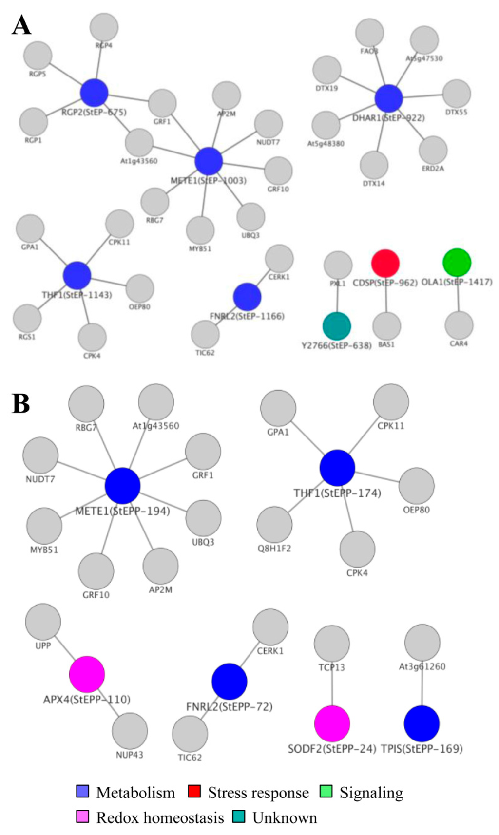 Next, we examined the phoshoprotein relays and interactors in the network to elucidate role of post translational modifications in the ECM (Figure 6B and Table S7). The wall pH and ROS formation is greatly affected by phosphoprotein’s non-stochiometric attributes. Our network was predominated with phosphoproteins related to redox homeostasis consisted of ascorbate peroxidase (StEPP 110 and 171), superoxide dismutase (StEPP 24, 67, 111, and 225), and ferredoxin reductase (StEPP 43, 72, 122, and 179) suggesting that these interactors might regulate physicochemical properties of the ECM. Furthermore, phosphoproteins associated with wall metabolism like triose phosphate isomerase (StEPP 169) and methionine synthase (StEPP 135 and 194) represent key components which are known to affect carbohydrate and amino acid metabolism [46]. Altogether, this data demonstrate that protein and phosphoprotein signatures can functionally link translational changes to organelle function.
