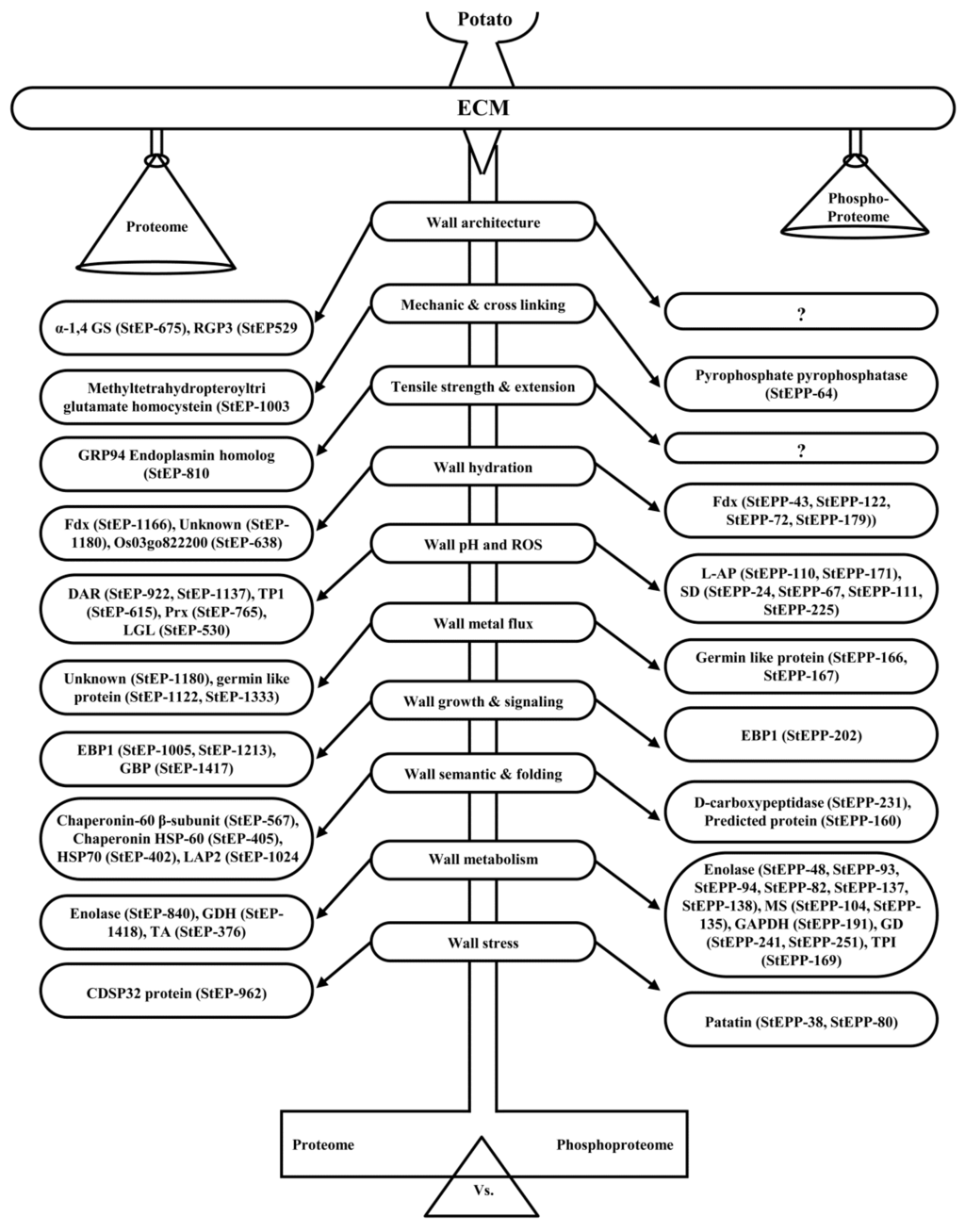 This study is directed towards the systematic analyses of ECM proteoforms in a tuber crop, potato. A model illustrating the structural and functional network associated with cell wall integrity and dynamics is depicted in Figure 7. The structural network comprises the proteins and phosphoproteins known to participate in cell wall organization and remodeling.