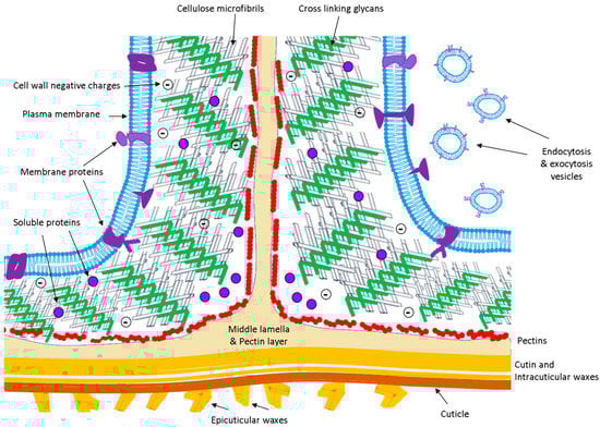 The established network of the cell wall components confers a given porosity to the matrix, i.e., the three-dimensional space in which molecules can diffuse. While water and ions can freely move in the extracellular matrix, it is considered that the movement of particles with a diameter greater than ≈4 nm is conditioned []. Roughly, proteins as small as 20 kDa are considered too large to move freely within the network.