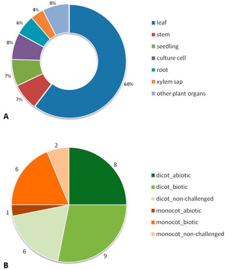 Graphical representation of the 52 original research articles considered in our review by: (A) plant organs; (B) leaf papers in the three experimental conditions (abiotic and biotic stress, and non-challenged) of dicotyledoneae and commelinid monocot plants.