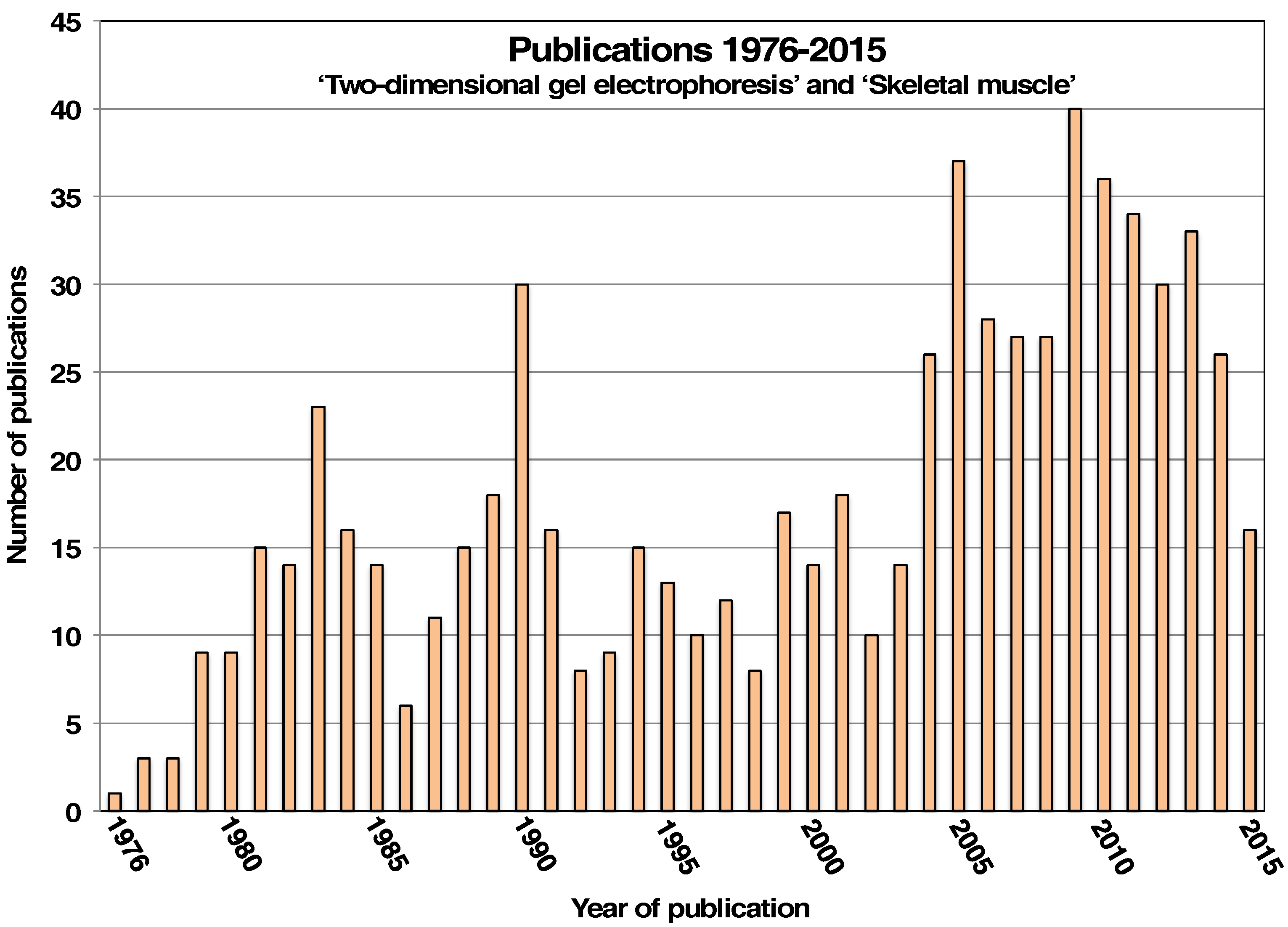 Summary of the number of publication entries with the keywords “two-dimensional gel electrophoresis” and “skeletal muscle” registered with the PubMed databank of the US National Library of Medicine ranging from 1976 to 2015.