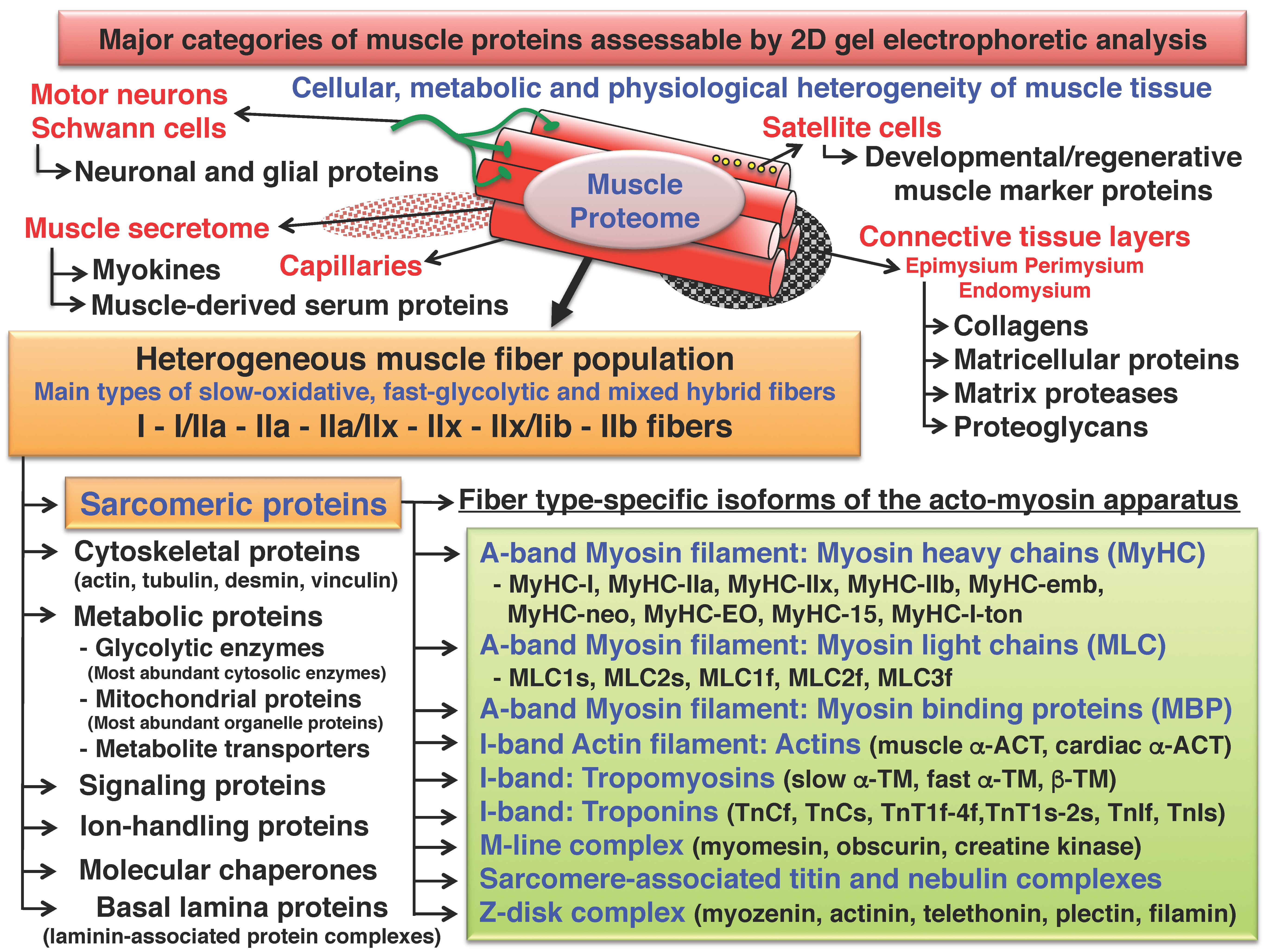 As outlined in Figure 2, conventional biochemical approaches and more recently established MS-based proteomic methods have integrated the 2D-IEF/SDS-PAGE technique as a highly suitable method for detailed investigations into skeletal muscle proteins. It is important to mention that skeletal muscle tissues are heterogeneous in their composition and highly dynamic in their response to cellular, metabolic or physiological challenges [26]. The main contractile units of an individual skeletal muscle are presented by diverse fiber populations, consisting usually of slow-oxidative, intermediate fast-glycolytic/oxidative and fast-glycolytic cell types, as well as mixed hybrid fibers. This relates to the histochemically well-defined fiber types I, IIa, IIx and IIb, and the hybrid fibers I/IIa, IIa/IIx and IIx/IIb [27]. The internationally agreed nomenclature of muscle fiber types is based on the distribution of myosin heavy chain (MyHC) isoforms [28]. Besides contractile fibers, muscle tissue contains motor neurons with their extensive myelin sheets, an elaborate network of capillaries, satellite cells and multiple layers of connective tissue, including the epimysium, perimysium and endomysium [29]. Biochemical studies using homogenized tissue preparations have to take into account this cellular heterogeneity of skeletal muscles [21], as well as the presence of actively secreted and passively released fiber-derived proteins that constitute the muscle secretome [30].