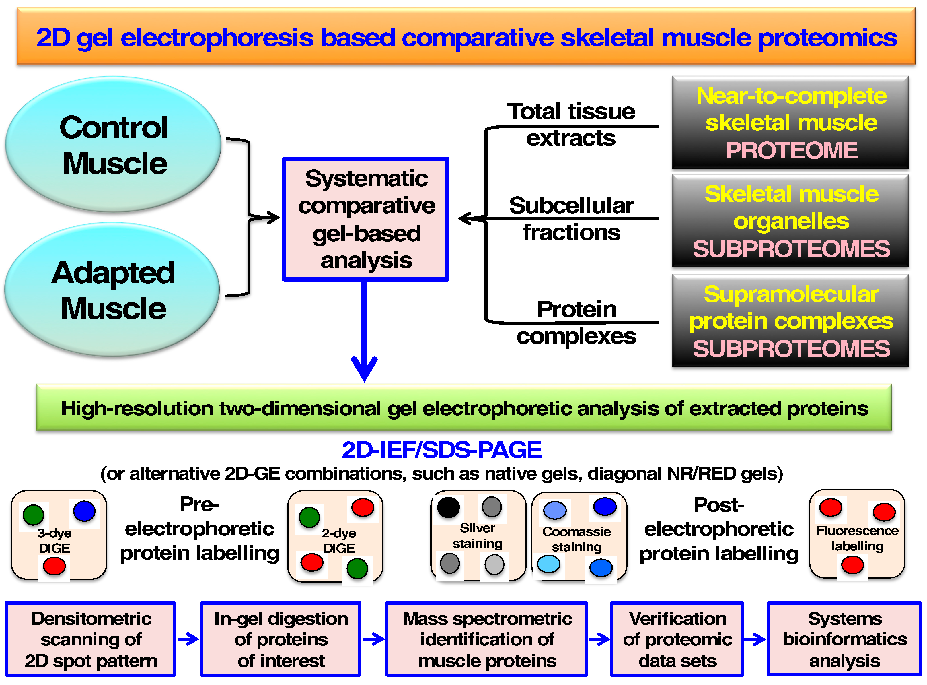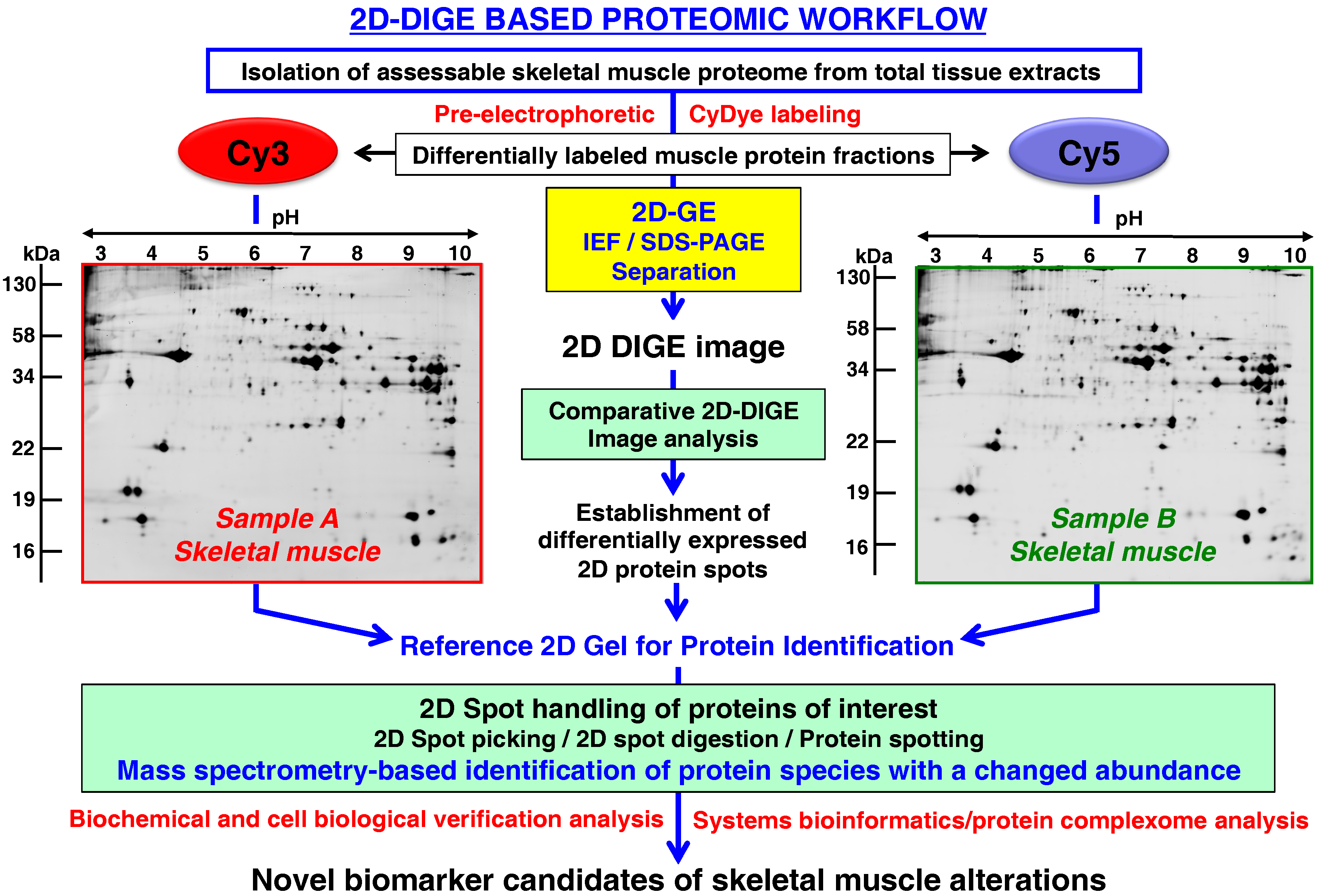 - Rapid and quantitative analyses of paired protein samples can be conducted. An example of an extremely powerful comparative 2D-GE method is the fluorescence 2D-DIGE technique [108] that eliminates gel-to-gel variations by the differential pre-electrophoretic labeling of protein fractions and the subsequent separation on the same 2D gel followed by image analysis [109]. See below section for details on the DIGE method and its application in skeletal muscle proteomics.