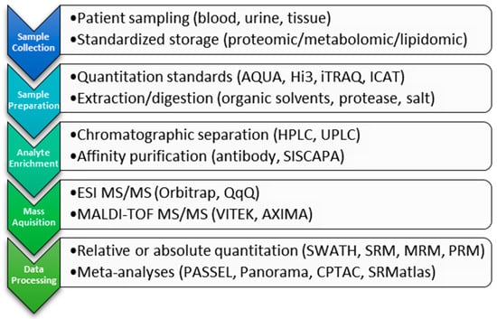 - Percy, A.J.; Byrns, S.; Pennington, S.R.; Holmes, D.T.; Anderson, N.L.; Agreste, T.M.; Duffy, M.A. Clinical translation of MS-based, quantitative plasma proteomics: Status, challenges, requirements, and potential. Expert Rev. Proteom. 2016, 13, 673–684. [Google Scholar] [CrossRef] [PubMed]