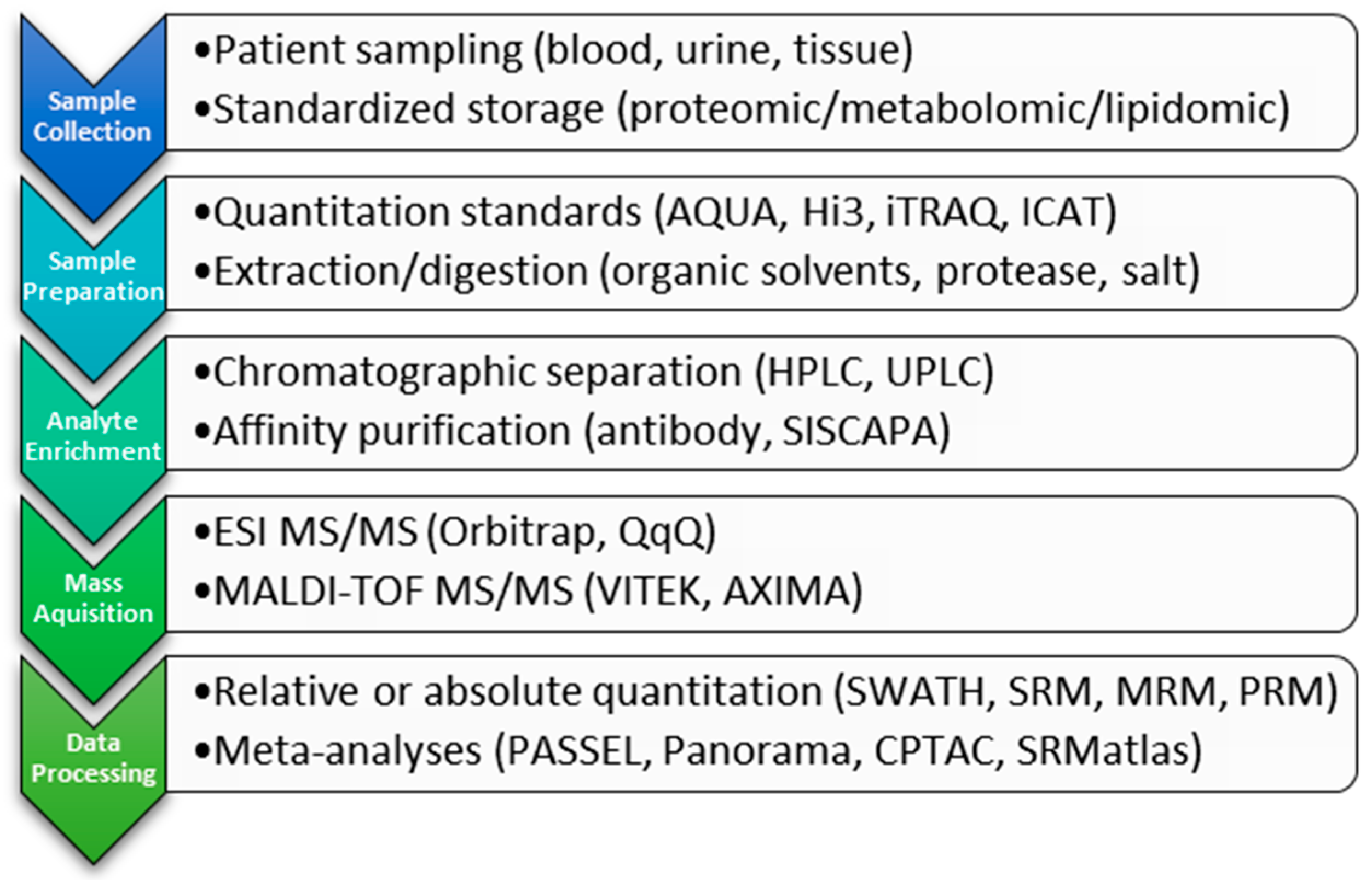 Although the field of proteomics offers a great deal of promise in these areas, few assays or valid markers have made their way into the clinical laboratory [21,22,23,24,25]. The reasons for discrepancy between basic and clinical research are in part due to the complexity of the analyses and the variety of means to accomplish it. The new field of clinical mass spectrometry proteomics (cMSP) [26] seeks to unify disparate basic science approaches and validate them for clinical proteomics [21].