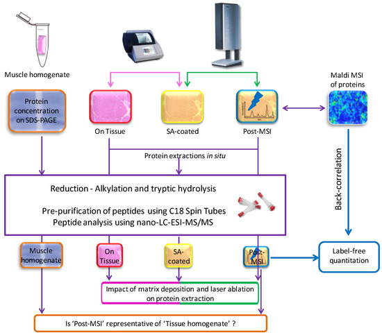 This study aimed at linking results from MALDI-MSI with potential peak identification and relative label-free quantitation obtained by LC-MS/MS. For this, we developed a new workflow combining MALDI-MSI on a muscle section, protein extraction ‘post-MSI’ from the same section, their identification by LC-MS/MS and their relative quantitation by label-free analysis. At first, we studied the impact of matrix deposition and laser ablation on protein extraction from tissue sections. Then, we did a back-correlation of the m/z of the ‘post-MSI’ proteins to those of the proteins detected by MALDI-MSI. This allowed us to correlate the label-free quantitation of proteins identified by LC-MS/MS with their peak intensities observed by MALDI-MSI.