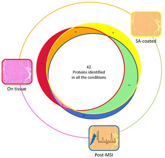 Venn diagram representing the number of proteins identified on muscle tissue section (‘On Tissue’, red circle), on sinapinic acid–coated section (‘SA-coated’, yellow circle), and after-MSI acquisition (‘Post-MSI’, blue circle); 42 proteins were common to all conditions, 4 were only identified in ‘SA-coated’ condition, 2 were only identified in ‘Post-MSI’ condition, 5 were only identified in ‘On-Tissue’ condition, 11 were common to ‘SA-coated’ (in green) and ‘Post-MSI’ conditions, 6 were common to ‘SA-coated’ and ‘On-Tissue’ conditions (in orange), 2 were common to ‘Post-MSI’ and ‘On-Tissue’ conditions.