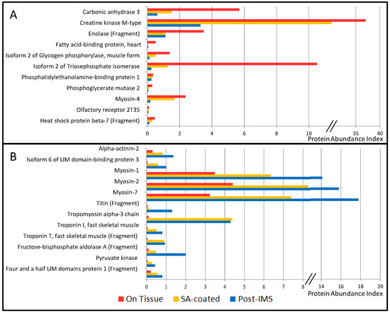 Representation of protein abundance index decreasing (A) and increasing (B) during the three extraction procedures (i.e., ‘On Tissue’ in red; ‘SA-coated’ in yellow; and ‘Post-MSI’ in blue).