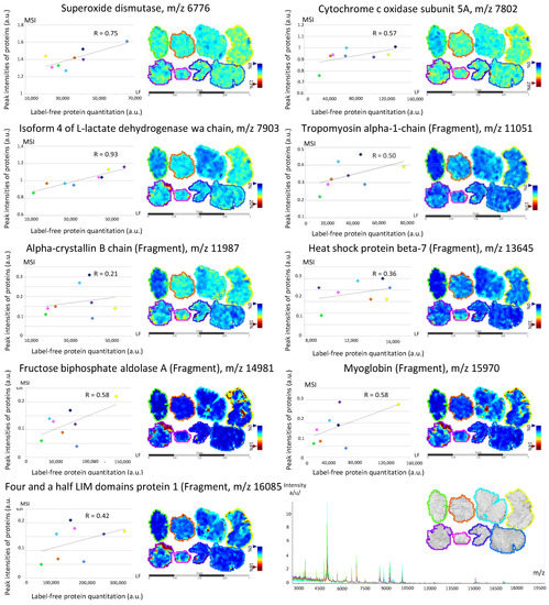 The label-free strategy was then applied to compare quantitation of ‘Post-MSI’ proteins extracted in situ and their MALDI-MSI peak intensities. The analysis resulted in the quantitation of 35 proteins from the 57 identified in ‘Post-MSI’ (Supplementary Data 4), and gave a relative quantitation for all proteins linked to a peak observed by MALDI-MSI. We calculated the correlation between the label-free quantitation of ‘Post-MSI’ proteins and the peak intensity observed by MALDI-MSI (Figure 5). Except for α-crystallin B chain (fragment), which showed a correlation index of 0.21, we observed good correlations between both approaches: 0.36 for heat shock protein β-7 (fragment) and 0.42 for four-and-a-half LIM domain protein 1 (fragment); 0.50 for tropomyosin α-1 chain (fragment), 0.57 for cytochrome c oxidase subunit 5A, mitochondrial; 0.58 for both fructose-biphosphate aldolase C (fragment) and myoglobin (fragment); 0.75 for superoxide dismutase; and 0.93 for isoform 4 of l-lactate dehydrogenase A chain (with a significant result for the last two). These results demonstrated the relevance of the MSI~LC-MS/MS-LF workflow as a proof-of-concept, which aimed at linking MALDI-MSI peak intensities with label-free quantitation. To the best of our knowledge, this is the first time that such a study has been presented.