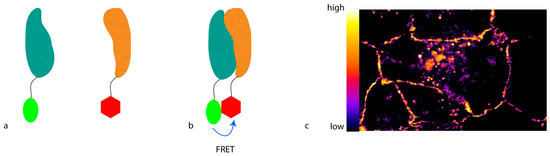 Förster resonance energy transfer (FRET). (a) Fluorescent proteins (proteins in teal and ochre; donor molecule in green, and acceptor in red) fused to the protein of interest are expressed ectopically in the cell. In the absence of interaction between the proteins, no energy transfer occurs; (b) If interaction occurs, the two fluorescent proteins come in close proximity to each other. FRET can occur due to energy transfer from the donor to the acceptor molecule; (c) Depending on the readout, a heat-map can be generated, showing regions of high and low interaction.