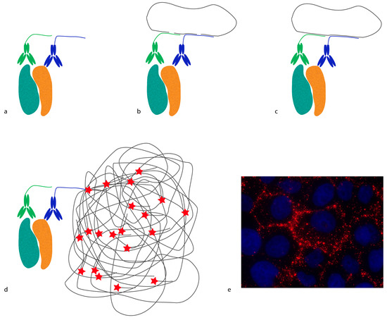 In situ proximity ligation assay (in situ PLA). (a) Recognition: A pair of antibodies conjugated to oligonucleotides (proximity probes) binds a protein complex (teal and ochre); (b) Hybridization: two circularization oligonucleotides (grey lines) with regions complementary to parts of the proximity probes’ oligonucleotide sequences are added; (c) Ligation: The circularization oligonucleotides are joined by ligation to form a complete DNA circle; (d) Rolling circle amplification (RCA): The ligated circle serves as amplification template where one of the proximity probes acts as a primer for phi29 polymerase. As a result, an RCA product is synthesized: a single-stranded DNA molecule attached to the proximity probe that contains hundreds of repeated sequences required for detection. Detection is achieved by the addition of a complementary detection oligonucleotide labeled with a fluorophore (red star); (e) In situ PLA image depicting the interaction between E-cadherin and β-catenin in MCF-10 cells. The in situ PLA signals appear as discrete red dots in the areas of cell-to-cell contact, and the nucleus is visualized by Hoechst staining (blue).