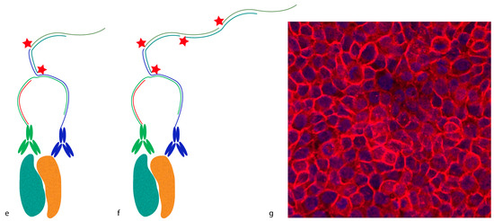 Proximity-dependent initiation of hybridization chain reaction (proxHCR). (a) Two proximity probes—i.e., antibodies conjugated to proximity hairpins (PH1 in green and PH2 in blue)—bind a protein complex (teal and ochre). Subsequently, an activator oligonucleotide is added (red line); (b) The activator breaks the secondary structure of PH1 open and binds to it, releasing its 3′-end; (c) The open PH1 can now invade PH2, thereby liberating its 3′-end. The latter can initiate the hybridization chain reaction (HCR); (d) The 3′ initiator sequence invades a fluorophore-labelled hairpin (teal line with a red star); (e) which then commences a chain reaction of invading and activating other such hairpins; (f) The reaction continues until depletion of the available fluorescent hairpins; (g) ProxHCR microscopy image: detection of interaction between E-cadherin and β-catenin in HaCaT cells. ProxHCR signal is shown in red and nuclei are stained in blue with Hoechst.