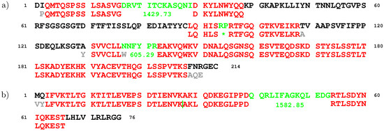 The alignment of the gapped strings against the respective protein sequence: (a) for the light chain of alemtuzumab; (b) for ubiquitin (a contaminant from the CAH2 sample). The matching fragments (up to the I/L substitution) of the gapped strings and protein sequences are marked in red; the spurious amino acids of the gapped strings are shown in gray. The gap sizes (in Da), along with the corresponding fragments of the protein sequences, are depicted in green. The zero-size gap between two adjacent fragments of ubiquitin that appeared as part of the input is indicated with the green vertical bar. The gap in the second gapped string for the light chain of alemtuzumab, labeled with the green asterisk, comprises Da, and thus, approximately equals the mass of its corresponding dimer RP. All the other gaps accurately match the respective theoretical estimates as well.