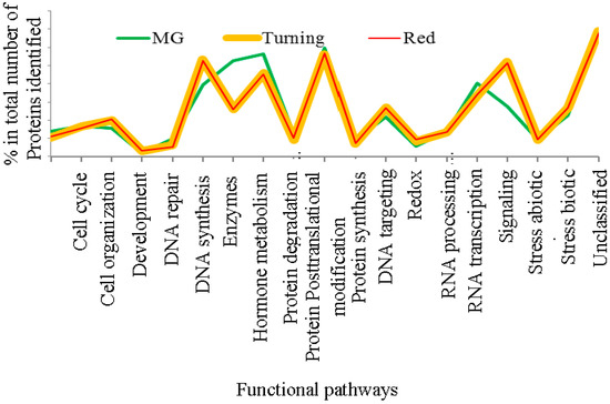 Using the criteria of two unique peptides per protein, 809 proteins were quantified for MG tomatoes and 600 proteins for both turning and red tomatoes each. When these proteins were analyzed for functional pathways in MapMan, it was found that protein expression in MG tomatoes differs from those from turning and red tomatoes, which display more similar protein expression patterns, as can be seen from Figure 2.