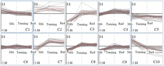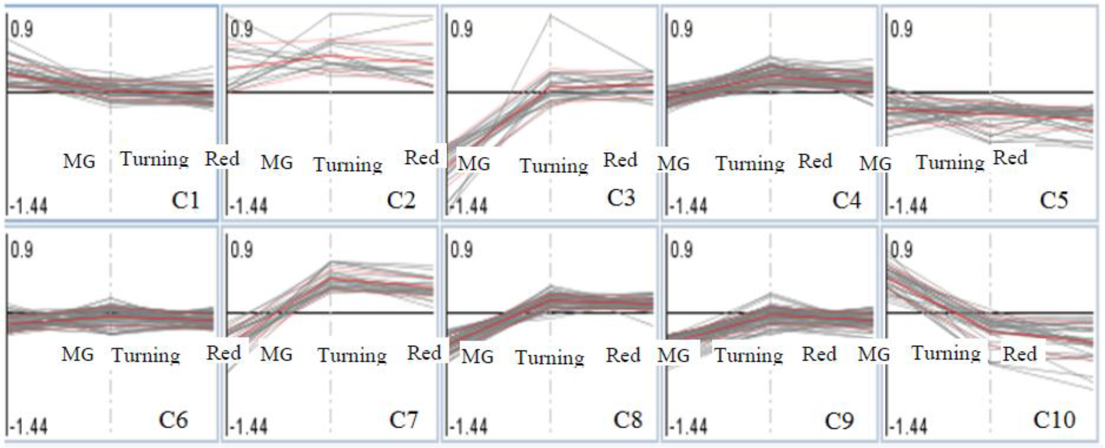 Proteins identified in MG, turning and red tomatoes were placed into 10 clusters (Figure 3), and those showing significant changes in any one of the three tomato ripening stages between Al-treated and La-treated groups (log2, ±0.6-fold, Al-treated/untreated; p < 0.05) are listed in Table 2. In Clusters 1 and 2, proteins were either induced by Al treatment or showed no difference with La-treated tomatoes. In this group, only one protein (Cc-nbs-lrr, resistance protein) passed the threshold for significant proteins in MG fruits. In Cluster 3, 15 proteins were significantly repressed in MG tomatoes, but not in turning and red tomatoes. Cluster 5 contains proteins that were repressed by the Al-treated compared to the La-treated group across the three ripening stages. Cluster 6 contains proteins showing no differences between Al-treated and La-treated groups. Cluster 7 contains proteins that were repressed by Al treatment in MG tomatoes, but induced in turning and red tomatoes. Cluster 9 contains proteins showing Al inducement in MG, but repressed in turning and red tomatoes compared to La treatments. Cluster 10 contains protein induced by Al-treatment in MG tomatoes, but repressed in turning and red tomatoes.