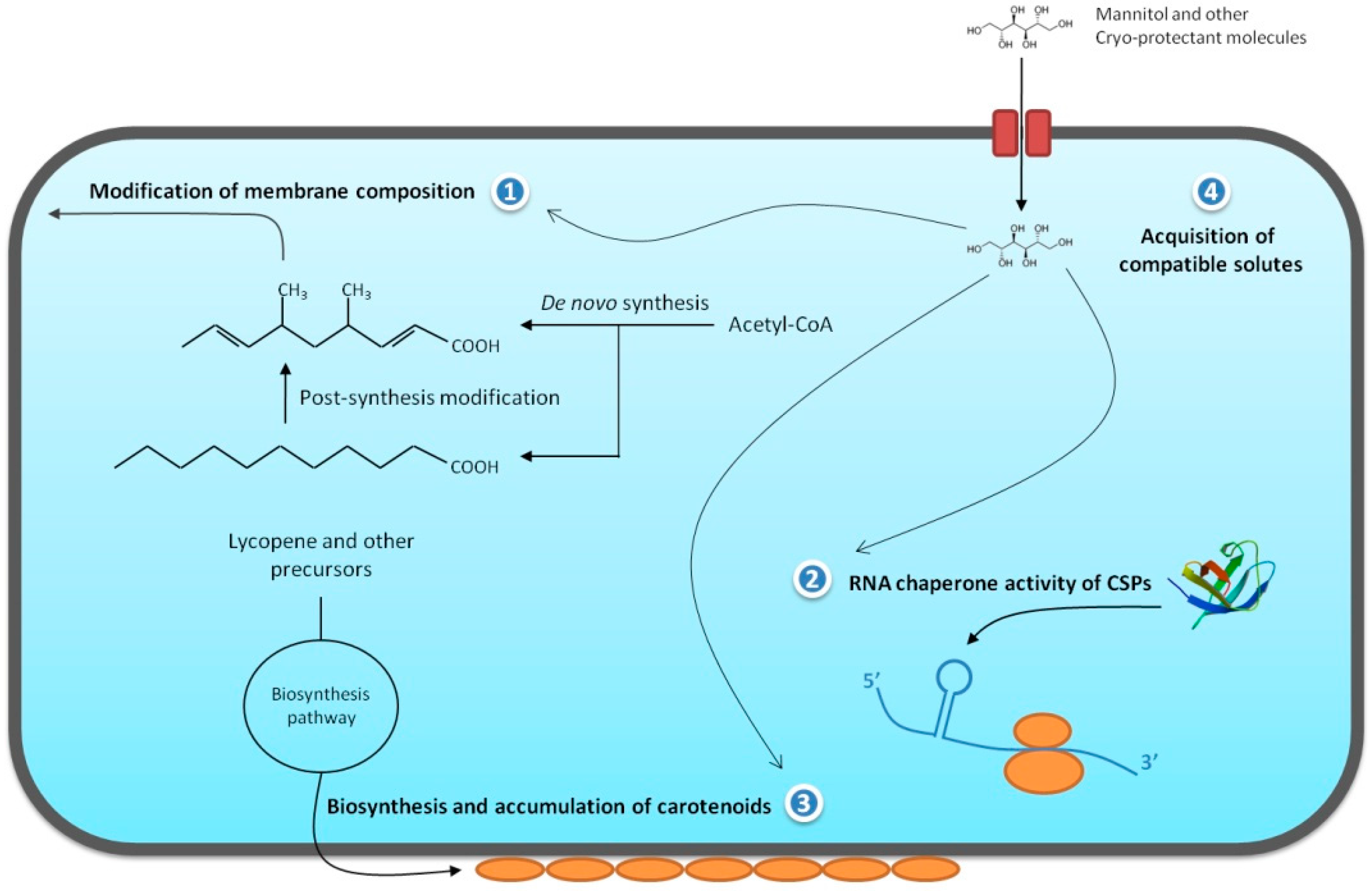 Representation of the main molecular modifications presented by bacterial cells during cold adaptation. Four adaptations are presented: (1) production of unsaturated branched-chain fatty acids to maintain membrane fluidity; (2) destabilization of adverse RNA structures by cold shock proteins; (3) production of carotenoids to assist in the maintenance of membrane fluidity and prevent cell damage by UV radiation; and (4) transport of compatible solutes such as mannitol to stabilize the cytoplasmic environment and prevent ice formation.