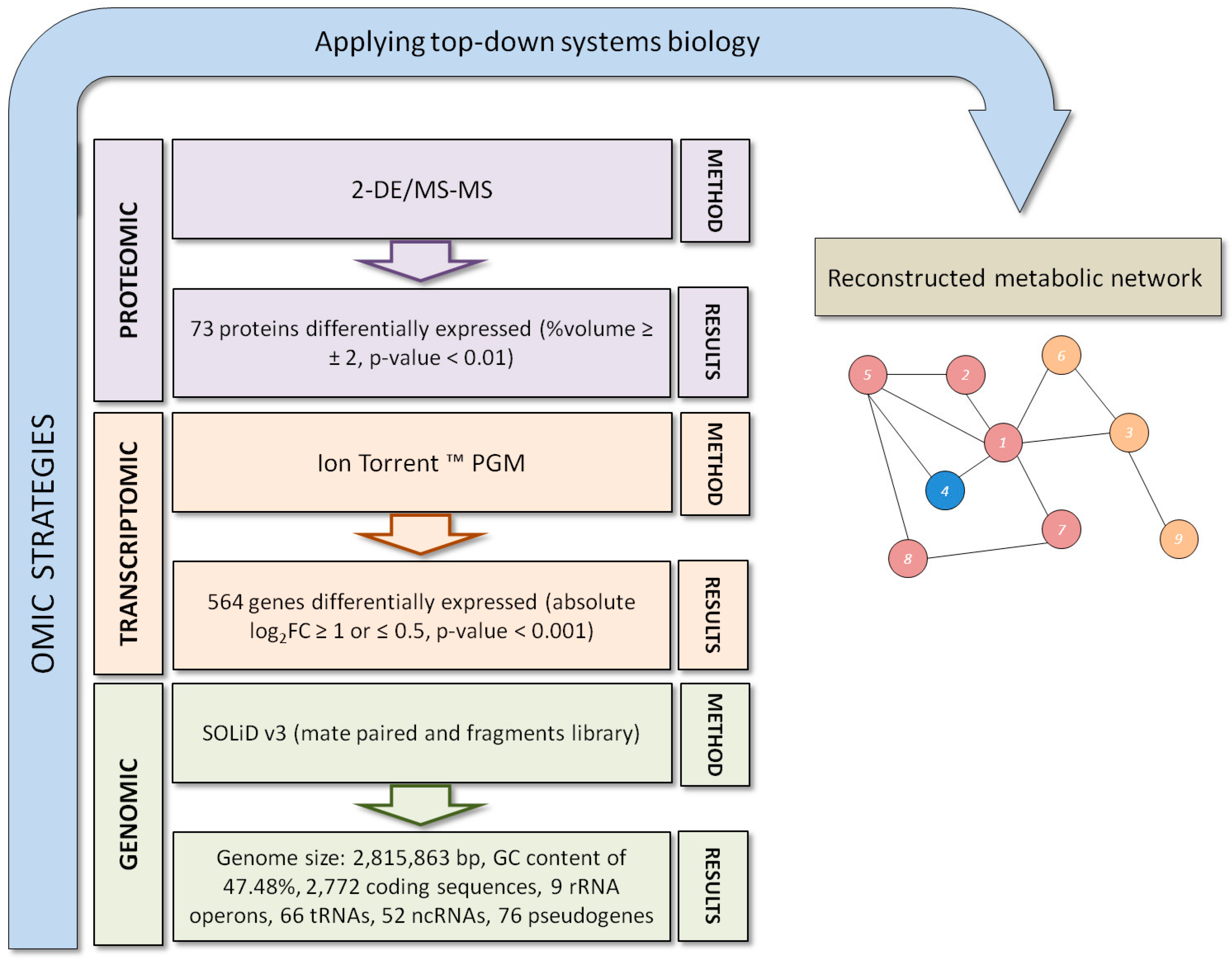Flowchart showing the omics strategies used to study cold adaptation of E. antarcticum B7. Each omic analysis contains the method used and the results achieved. This large amount of data can then be used to reconstruct metabolic models using top-down approaches of systems biology.
