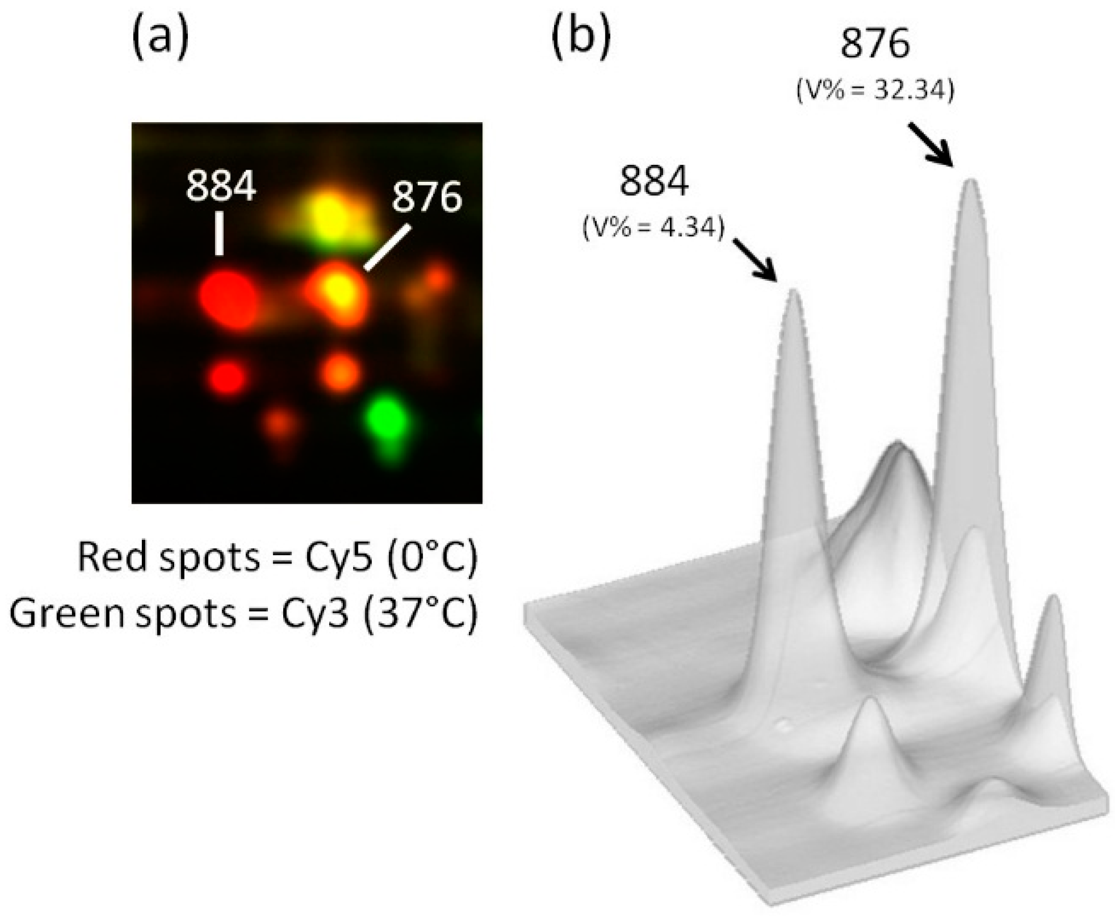 (a) Fraction of a Differential Gel Electrophoresis (DIGE) comparing the proteome of E. antarcticum grown at 37 °C (green spots) and 0 °C (red spots). Each spot is indicated by its ID; (b) Three-dimensional view of the spots with their respective values of volume percentage.