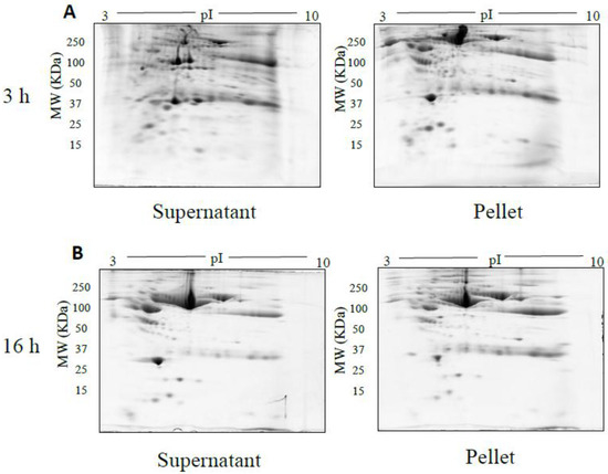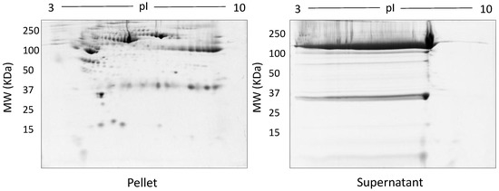 Representative gel images of supernatant and pellet fractions obtained after 3 h (A), 16 h (B) ultracentrifugation respectively. 100 µg of supernatant and pellet fractions was loaded onto a 7 cm 3–10 NL IPG strip, following 2DE on 12.5% acrylamide gel.