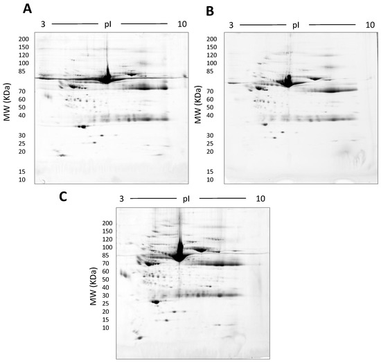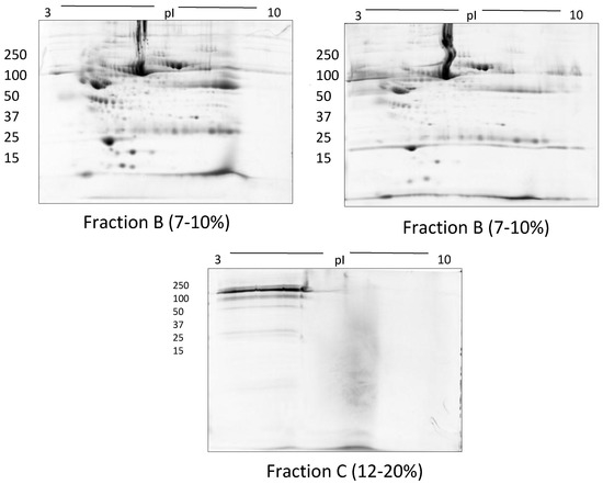 Here, 2DE was combined with 3DE (a postfractionation approach) and integrated with a well-established ‘deep imaging’ protocol [23,24,25]. For each 2DE analysis, 500 µg of protein was resolved on 17 cm, 3–10 NL IPG strips, as described above; areas of near-saturating signal (i.e., hyper-abundant proteins) were manually excised from the cCBB stained gels using a scalpel. Imaging was repeated at 750 V for higher sensitivity protein detection. All excised spots were further resolved using a standardized 3DE protocol. Briefly, those gels designated for 3DE were initially stained using the reversible zinc-imidazole protocol [24], and saturating spots/regions were excised, the zinc fixation reversed on both the main gel and the excised regions, and the latter were turned 90° relative to the initial path of resolution and then subjected to a third round of electrophoresis, on narrow gradient gels customized to the corresponding molecular weight region; 10–15% for heavy cut spots corresponding to 60–200 kDa and 15–18% for light cut spots corresponding to 10–50 kDa. Once electrophoresis was completed, gels were stained with cCBB, destained, and imaged as described above.