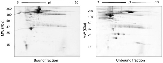 Representative gel images of bound and unbound fractions collected following use of the Bio-Rad Affi-Gel kit. Following manufacturer’s instructions, 100 µg of both bound and unbound fractions were resolved on 12.5% acrylamide gels after undergoing isoelectric focusing on a 3–10 NL IPG strip.