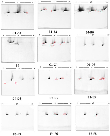 Third-dimension separations of high-density (i.e., hyper-abundant) protein regions excised from serum proteomes resolved by 2DE; red circles indicate protein species resolved from co-migrating hyper-abundant proteins. Designations A-F refer to excised gel regions (see Figure 8), and in each case the associated numbers refer to specific subsections of those excised gel pieces (i.e., A1-A3 means excised region A was subdivided into three approximately equal sized gel pieces that were then resolved in parallel on third gels (see Materials and Methods).