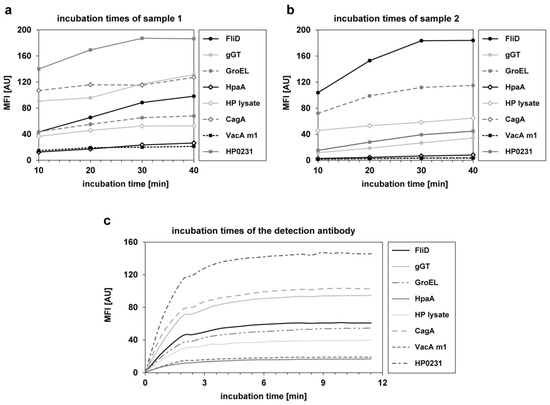 Investigation of the incubation times for the samples and the phycoerythrin labeled anti-human IgG detection antibody. (a,b) Four different incubation times (10 min, 20 min, 30 min, and 40 min) were tested in four samples. Depicted are the MFI values of all used H. pylori antigens of two samples. (c) Kinetic of incubation with the detection antibody for 11 min. A measurement was performed approximately every 30 s.