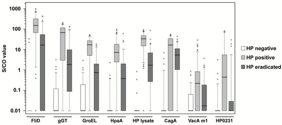 Boxplots of S/CO values in HP negative, HP positive and HP eradicated samples. Every box represents the interquartile range and the horizontal line inside the box is the median. Whiskers show the 5th and the 95th percentiles. Outliers are plotted as circles. For every antigen, the S/CO values of H. pylori negative samples (n = 63) are shown in white boxes, H. pylori positive samples (n = 139) are shown in light gray boxes, and samples of patients being eradicated for H. pylori (n = 63) are shown in dark gray boxes.