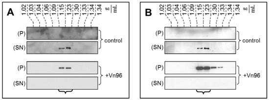 Western blot analysis of fractions recovered from sucrose density gradient isolation of SKBR3 extracellular vesicles (EVs) reveals the presence of exosomal marker proteins TSG101 (A) and Alix (B). These proteins remain in the supernatant in the control sample following low speed centrifugation. With addition of Vn96, the low speed spin recovers the same proteins in the pelleted material.